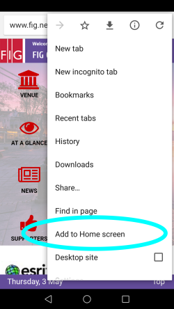 | Step 1: Go to www.fig.net/app and click on the dots in the right corner | Step 2: Click on 'Add to Home screen' | Step 3: Name the App something you prefer and click on 'ADD' |