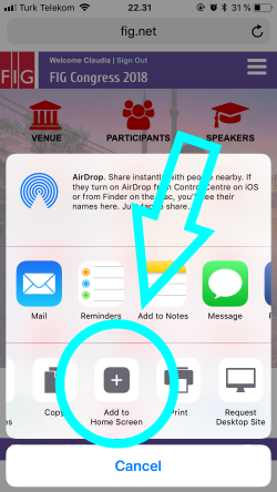 | Step 1: Go to www.fig.net/app and click on the share button at the bottom. | Step 2: Click on 'Add to Home screen' | Step 3: Name the App something you prefer and click on 'Save'' |