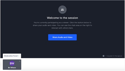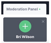 The moderators see a "Moderation Panel" at the bottom left of their screen. When you requests to go on-screen, your name and profile picture appear under the Moderation Panel.