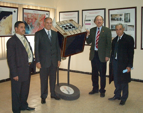 Model of the Algerian satellite ALSAT at CNTS: (from left) Ridha Bouras, Oran representative of OGEF, Director of CNTS Mohamed Benmohamed, FIG President Magel and Boulefrad Rahal, Member of the Board of OGEF.