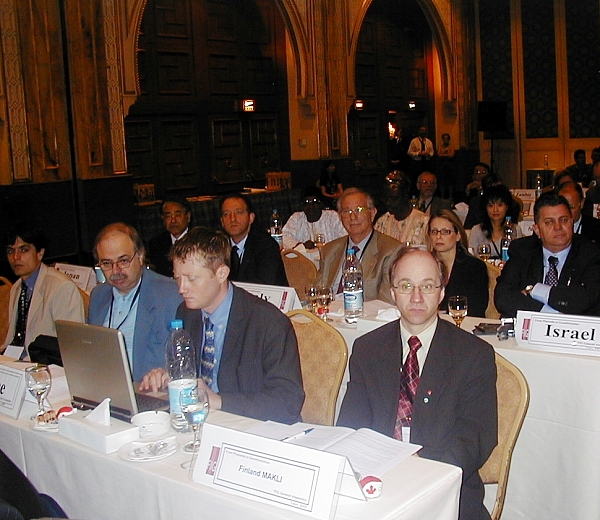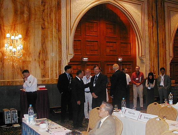 Matt Higgins (Comm. 5) and Adam Greenland (Comm. 4) discussing the commission issues at the General Assembly. At the background Gerhard Muggenhuber (Comm. 3), Pedro Cavero (Comm. 2) and Klaus Rürup (Comm. 1).