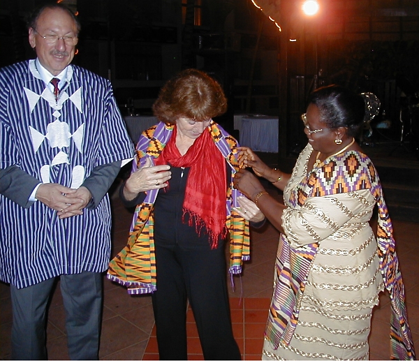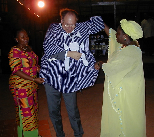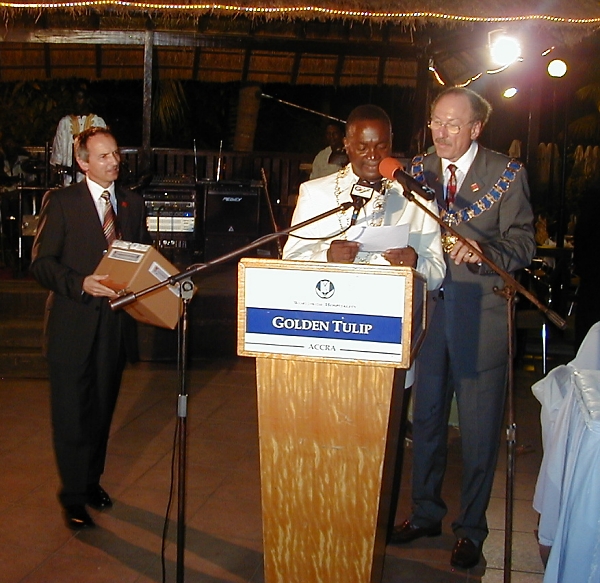 President Magel getting his gift from Yvonne Sowah and Dorothy Adotei
