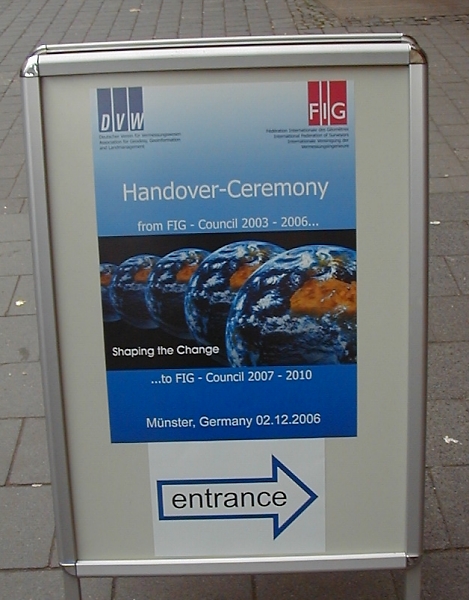 Leaving FIG President Prof. Holger Magel mentioned in his speech “Changing FIG – Model for a Changing World” that inauguration in the surrounding of the Hall of Peace in Münster is a special symbolic sign for the new leadership: the FIG community of idealists and volunteers has dedicated itself to worldwide peace through numerous contributions in the field of land, water and coastal management, settlement, the equal development of urban and rural areas, the guarantee of property and tenure, building of functioning market economies, of environmental protection through data acquisition and data processing as well as monitoring of measurements on land, from the air and space, etc. As surveyors, with our "boots on the pavement" on site with our clients or in ministries, public authorities, offices, undertakings and universities we know that ultimately, and indeed, it is a matter of not only doing our duty but always doing more. This ethos makes FIG so valuable for the world and world organizations as the UN authorities, the World Bank and for member associations. The German Council set itself ambitious aims, as to exercise intellectual leadership concerning the role and identity of surveyors, to continue the FIG reorganisation, to generate more income, to increase substantially membership of FIG, to promote a professional of outcome and results of FIG meetings, to increase co-operation with the United nations including the World Bank (to increase commitment for the poor in the world), to increase co-operation with sister organisations, to give greater presence on spot in the regions, to strengthen the bridging within the FIG between practitioners and academics and to acquaint young persons. FIG is present at all continents; it combines almost all religions, cultures, different forms of ownership and tenure, state organisations, etc. If the FIG did not already exist, it would be urgently necessary to found it! In the name of all members of the FIG Council Prof. Magel stated that the FIG years were strenuous but at the same time wonderful. He expressed words of thanks to DVW, FIG members and his team in the Council: Dr. Andreas Drees, Dr. Ralf Schroth, T.N. Wong, Ken Allred, Stig Enemark and Thomas Gollwitzer as well as to Matt Higgins (2005-2006) and Gerhard Muggenhuber (2003-2004) as the ACCO representative in the Council. He wished the new Council success in its responsibility in favour of FIG, the mother of all surveying engineers and surveying.