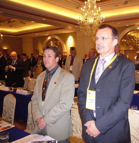 Commission Chairs Alojz Kopacik and Andras Ossko listening the FIG fanfare.
