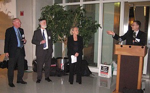 Klaus Deininger introduces the key people at the opening reception: Stig Enemark,  FIG (left), Mark Crackler, WG ARD and  Inga Björk-Klevby, UN-HABITAT.