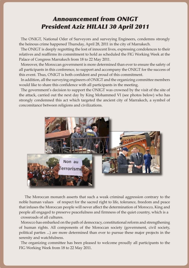 "FIG regrets the incident in Marrakech earlier today with reported casualties. We are keeping watch on the situation together with our local co-organiser knowing full well that situation such as this can change very suddenly, for the worse or for the better. The FIG 2011 Working Week is still some 19 days away and we will need to keep abreast with latest development in Marrakech and Morocco from now on. We are very mindful of the security and safety of all intended participants at our upcoming FIG Working Week, and we advise all participants to base their decision to travel to Marrakech on the extent of governmental advisories and prohibitions, on their own assessment of the level of personal safety and more importantly the level of anxiety of their loved ones who stayed home.