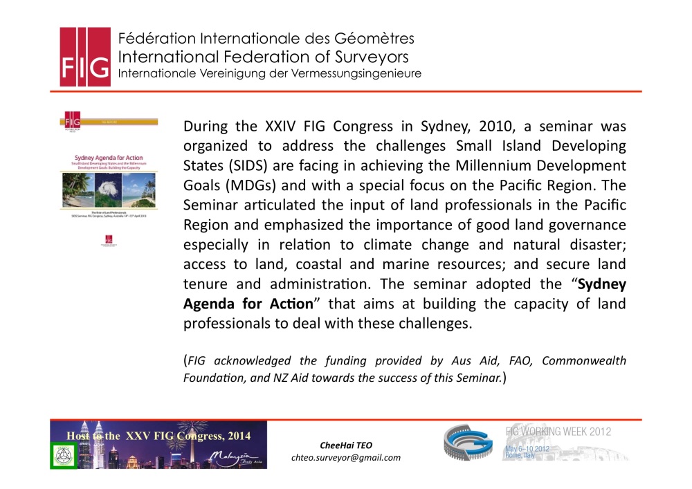 The challenges of small island developing states in the Pacific in participating in PCGIAP’s meeting and activities was highlighted and FIG expressed its desire to collaborate with PCGIAP in particularly to further the intent and objects of the FIG “Sydney Agenda for Action”. FIG and the Task Force on Surveyors and Climate Change should begin a dialogue with her member associations in Australia and New Zealand to consider avenues to further the intent and objects of the FIG “Sydney Agenda for Action”. This also has to be taken into consideration the light of the United Nations Conference on Sustainable Development (Rio+20) in Rio de Janeiro, Brazil between 4 – 6 June 2012.