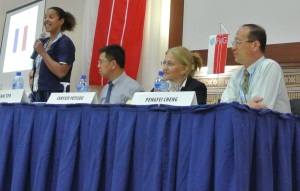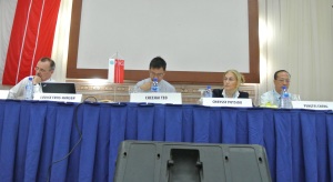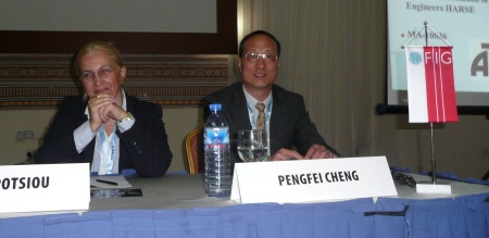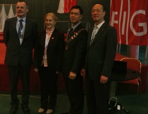 FIG Vice Presidents  Pengfei Cheng (right), Chryssy Potsiou and FIG President CheeHai Teo following Diane Dumashie's report.