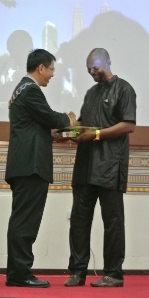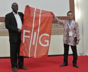 Stephen Olubode Adeaga, President of NIS handing over the FIG Flag to Mohammad Azmi Mohd Zin, President of Association of Authorised Land Surveyors Malaysia, PEJUTA