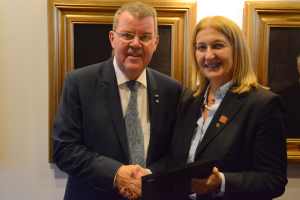 Chryssy Potsiou presents certificate to Henning Elmstroem