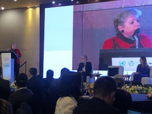 Mikael Lilje, David Elegbede with Zaffar Sadiq Mohamed-Ghouse, Vice President Woolpert. H.E Ms. Alicia Barcena Ibarra, Minister of Environment and Natural Resources Mexico delivering her keynote address.