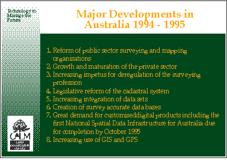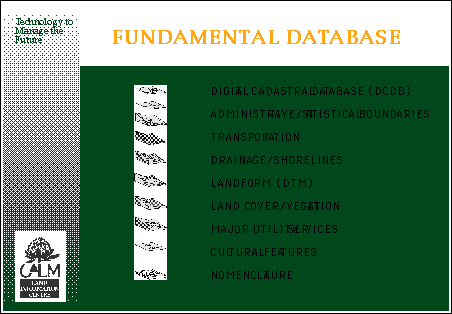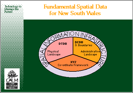 The spatial information trinity of the coordinate system, the administrative landscape and the physical landscape make up the spatial information infrastructure. In Australia the mathematical basis which provides the spatial rigour is in place and spans from the geodetic network to the survey control network which in turn is connected by direct survey means to the legal cadastral parcels. The administrative landscape is now manifested by the digital cadastral data base (DCDB) and the administrative local, state and national boundaries which overlay that digital data foundation. Indeed it (DCDB) is the reflection of mans imprint on the landscape. The physical landscape is now the digital product which was previously known as the topographic data base (DTDB) (diagram 2).