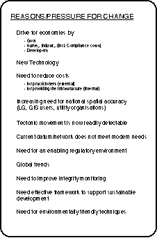 I have been concerned for some time that the window of opportunity was opening and that the opportunity could be missed if not grasped at the right time. One of the aims of DOSLI's (Department of Survey and Land Information) restructuring is to facilitate the management of the Survey System infrastructure and its development. The role of the survey industry is also important as the acceptance and success of any major developments will depend upon all participants in and users of the system being consulted and involved in the change program.