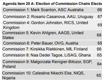 The appointment/election for Chairs Elects took place between Tuesday 8 April 12:00 Noon and Thursday 10 April 6:00 AM. Each election round was open for 20 hours. Only for Commission 3 there were more than one candidate and an actual election was taking place between the three candidates.