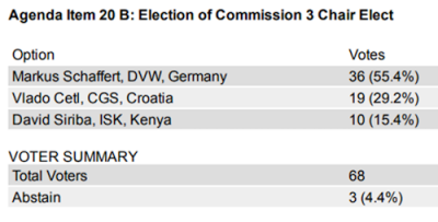 Decision: The motion was adopted. For Commission 3 there was only one round of voting. Since Markus Schäffert obtained 55.4% of the votes which is more than 50% he was elected with no second round of voting. There were 68 voters of which 3 abstained.