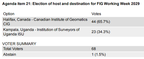 Decision: The motion was adopted. The Canadian Institute of Geomatics with Halifax, Nova Scotia as destination received 44 votes equivalent to 65.7% of all votes and will be the host and destination for the FIG Working Week 2029. FIG President thanked both bidders for their good bids and for their willingness to take an active role in FIG.