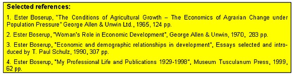 Perhaps I should add, that EB lived in Geneva 1947-57, where she worked for United Nations' Economic Commission for Europe (ECE), in India from 1957-60 and 1964-65 in Senegal. Furthermore, she has travelled /worked extensively in Southeast Asia and in Africa as a consultant and researcher for the Danish Ministry of Foreign Affairs and international organisations. She was married to Mogens Boserup, also an economist, with whom she had three children. It is easy to get an overview of her works, as she wrote a handy description and index herself at the mature age of 88, ref. 4 "My professional life and publications 1929-1998", 62 pp., which was published the same year as she died, in 1999.