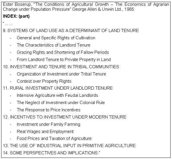 In the latest review of the World Bank, "Land Policy and Administration - Lessons learned and new challenges for the Bank's development agenda", 2001, edited by Klaus Deininger, there is included a comprehensive list of references on land tenure issues, most of which are rather re-cent works. One of the older ones, from 1965, "The economics of Agrarian Change under Population Pressure", by Ester Boserup, arose my interest both due to its title, age and not the least its author. She was a Danish economist, who qualifies for further interest by land surveyors for a number of reasons: She was an economist with an attentive eye on land tenure systems - one could say as a forerunner for Hernando de Soto - and for the role of women in development.