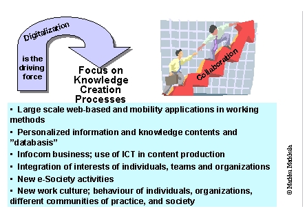 Increasingly opportunities are emerging through the development of information networks and software packages for systematic knowledge management development. The global sources of knowledge are available at work places and educational establishments – any place where there is a computer with an Internet connection. The deployment of web-based work methods along with the development of group-specific methods will increase the teams’ and communities’ results, especially in cases where the people are mobile and when working permanently in a joint physical space is not possible or expedient.