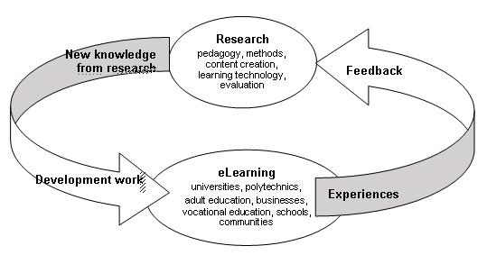 The aim of the Cluster is to quickly make the latest research results available for the development of teaching and training projects, and, in return, to receive feedback from the field to initiate new research (figure 6). At the same time, co-operation is promoted between the various levels and fields of education and training. In the Finnish experience the Cluster’s multidisciplinary research activities support the development of the Finnish Virtual University, Virtual Polytechnic, and Virtual School. Virtual teaching projects provide an excellent environment for experimentation and research, with the possibility arising to apply research results to network-based teaching without delay. This means that research and practice continually interact.