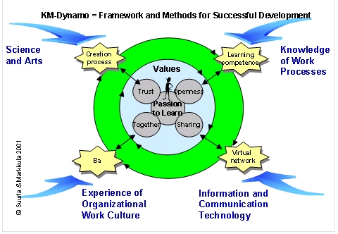 Developing the methods of individual and communal knowledge management – the creation and use of a toolbox culture – is the basis for learning organizations. The Knowledge Management Dynamo (KM Dynamo, figure 7) is a knowledge management concept that has been described, for example, in the report: “Developing and Implementing Knowledge Management in the Parliament of Finland” (Suurla, Markkula and Mustajärvi, 2002). The concept is intended to help individuals and communities in their determined effort to improve their work cultures. The dynamo is based on values, their significance for both individuals and communities, and the necessity of goal-directed action.