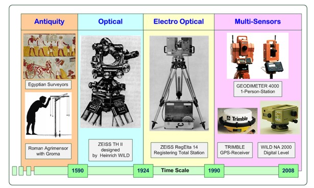 Measuring and surveying are not only activities which have been performed for thousands of years; they are furthermore an important part of our history of civilization. The technical development of surveying instruments can be divided roughly into four different phases (Fig. 1). The archaic Phase lasted thousands of years and ended in 1590 with the invention of the telescope.