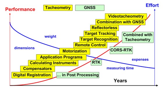 Fig. 2: The different steps of progress for tacheometry and GNSS during the last 20 years.