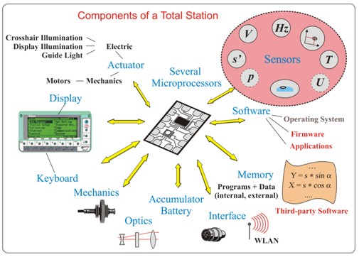We have noticed an enormous increase in functionality during the last 20 years thanks to manufacturers. All actual measurement systems are multi-sensor-systems, which are equipped with several sensors and driven by one or more microprocessors (Fig. 3). Raw observation values as we know them, for example from angular observations with an optical theodolite, no longer exist. The actual values shown on the display of the instrument are the result of multiple sensor readings, modified by a range of geometrical and physical parameters. These correction parameters and the entire correction model are not accessible to the user. The multiple sensor readings are used for the validation of the measurement itself (detection of outliers, beam interruption, etc.) and at the same time for an increase in accuracy.
