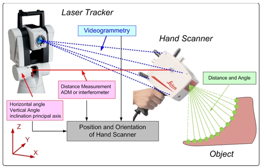 A laser tracker combined with a hand scanner is a good example of the complexity of the actual measurement systems (Fig. 4). The determination of the position and orientation of the hand scanner relative to the tracker is realized in real-time with measured angles and distances (position) combined with videogrammetry (orientation). The coordinates of the object are determined in relation to the actual position and orientation of the hand scanner.