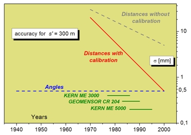 During the last 70 years the accuracy of our measurement systems has not always been improved. Height determination became faster and simpler with the introduction of digital levels, but there has been no systemic enhancement of accuracy. The situation for the measurement of directions and angles is quite similar. In contrast to this are electronically measured distances: we note that there has been a significant advancement in precision and accuracy.