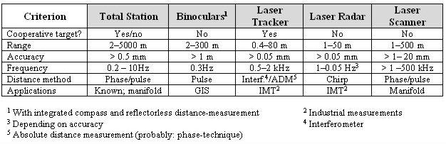 The combined measurement of angles and distances deliver polar coordinates in the two- or three-dimensional space. Based on this principle we find different types of instruments (Table 1).
