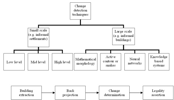 Figure 10. Change detection techniques categorized by scale (top); Phases of informal building monitoring (bottom) (source: Ioannidis et al, 2009)