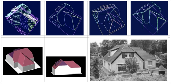 Figure 13: Steps in automatic extraction process of 3D building from LiDAR data –segmentation 4 segments handling 4 topological analysis 4 line and vertices extraction (top from left to right); the extracted 3D building and results verification (source: Abo Akel et al., 2006)
