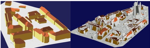 Figure 14: A 3D view of an urban neighborhood showing the original LiDAR data (right) and the complete reconstruction results (left) (source: Abo Akel et al., 2006)