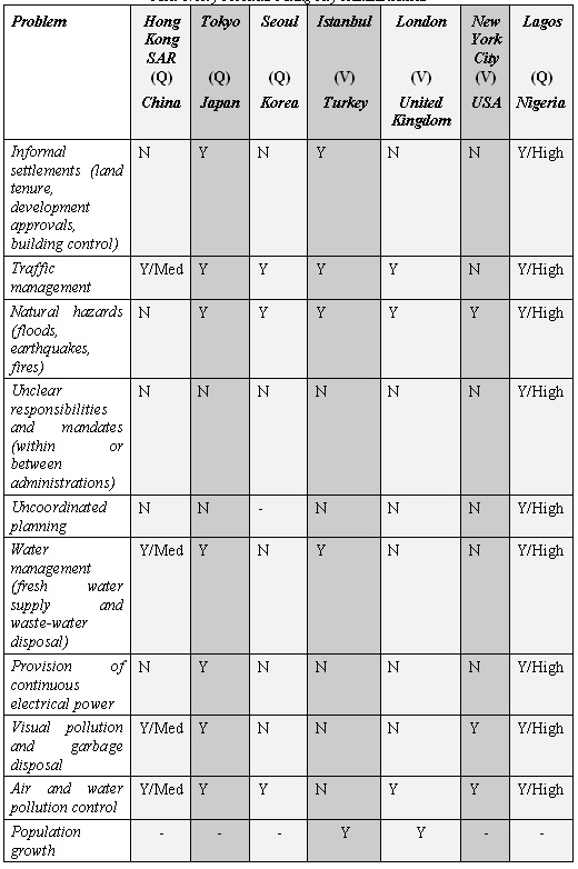During 2007–8 for the purposes of this research study, initial data about problems facing city administrators were obtained from seven cities (Hong Kong, Tokyo, Seoul, Istanbul, London, New York and Lagos) either by their direct response to the questionnaire (Q) or by personal visits (V) and interviews by the authors and contributors. Table 1 shows the information derived from that stage of research.