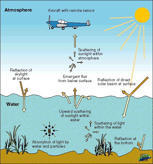 Figure 3. Atmospheric and water column effects on remote sensing data (according https://www.dmu.dk/rescoman/project/Backgrounds/challenges.htm).