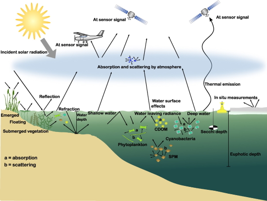 Figure 5. Interaction between radiation, remote sensing indicators of lake ecology and sensors (according Dörnhöfer & Oppelt, 2016).