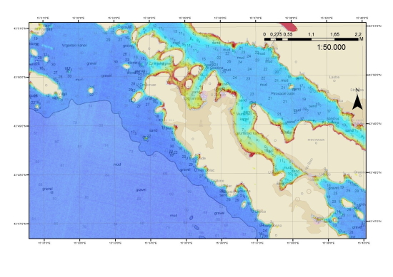 Figure 9 illustrate the estimated water depths of the wider area of Murterski Kanal channel computed by the satellite bathymetry model developed by Stumpf et al. (2003) from Sentinel 2 satellite images. In Figure 9 the depths are shown in the color range from 0 m (red) to 50 m (dark blue). By comparing the bathymetric map (depths and depth contours in the background) with ENC HR400512, it can be concluded that the depth gradients and coastline are actually very well surveyed by using SDB method, while individual shoals are not revealed because of the low spatial resolution of SDB method.