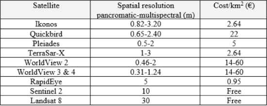 Table 1. Spatial resolution and the cost of individual satellite scenes used for SDB (according ARGANS, 2016) with personal data