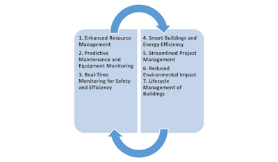 The Internet of Things (IoT) is transforming industries worldwide, and the construction sector is no exception. In the context of sustainable construction, IoT offers numerous benefits that can enhance efficiency, reduce resource consumption, and improve overall project management. By leveraging interconnected devices and real-time data, IoT can drive the construction industry toward more sustainable practices while increasing productivity and lowering costs. Figure 1 shown the list of benefits of IoT towards Sustainable Construction.