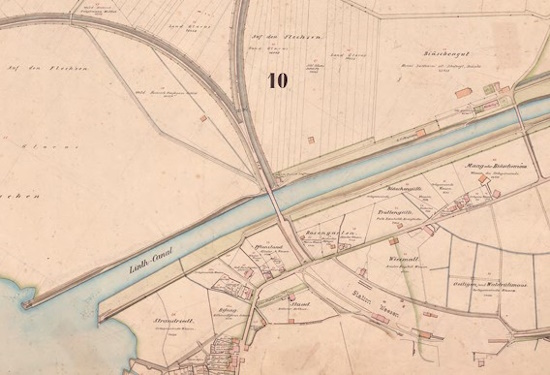 Fig. 7: Linthwerk plan: section of the Weesen area. Measured, drawn and hand-coloured by the 18-year-old Heinrich Wild. 46 individual plans (1:2000), 70 cm × 70 cm. (zVg Lintharchiv, signature LIAR F VIII. 19 [10]).