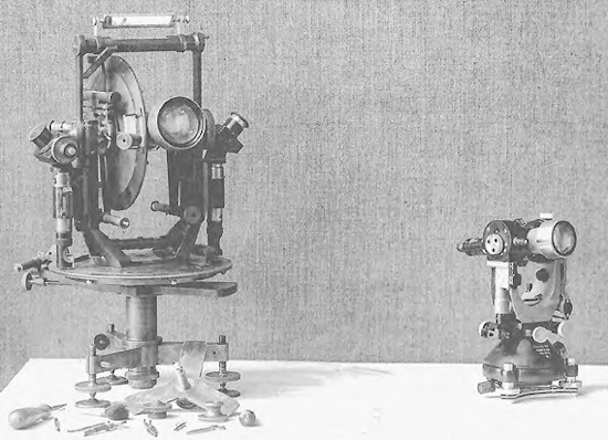 Fig. 8: Theodolite before Wild – and since Wild: Left: typical repeating theodolite around 1900 with a 30 kg transport weight. Right: revolutionary Wild T2 theodolite from 1923. Weight just 3 kg, with numerous other advantages for the surveyor. This theodolite design by Heinrich Wild has also become established worldwide for integrated distance measurement in total stations.