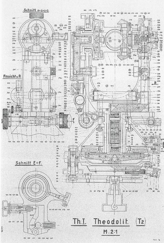 Fig. 9: Wonder: Heinrich Wild's design assembly drawing of the revolutionary fine-mechanical optical miracle of its first Heerbrugg theodolite Th.I,. later called and T2 from 1921/23.