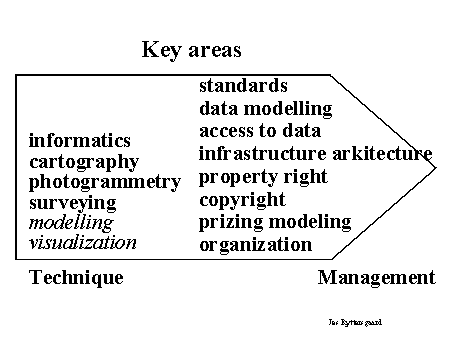 The developments are represented in the boxes. The box with "transactions" represents what will happen late 2000 when the private licensed surveyors begin to use the new Cadastral Information and Updating system (MIA). Self-government is about the situation where the individual citizen is able to serve himself through an Internet and/or WAP or digital TV solution. The change has been driven through a number of developments and changes of the entire organization, upgrading and change of competence, recruitment of new employees, etc. In 1992 the process started seriously with a 20% staff reduction. The derived savings financed outsourcing of the digitalization process. You can look at this as a process of developing the private sector. Since 1992 the staff profile has changed markedly. A change from craftsmanship to handling functions such as preparation of invitations to tender, contract negotiations, quality control, product development, establishing of partnership, consultancy and sale, etc. 6. THE EDUCATIONAL CHALLENGE.As shown in the previous there is an increasing need for persons with knowledge on infrastructure elements, analysis, modelling, visualization, negotiation, management etc. Persons who are less skilled in the technical disciplines than the traditional surveyors. The demands on "management" skills depend on the stage of development for the organization. As soon as you start to co-operate with none professional users you need a staff who are able to handle information and knowledge. A study of the ongoing development results in some general observation: