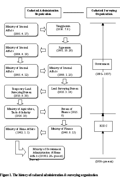Since the cadastral division was set up in the Ministry of Home Affairs in the Korean Empire in 1895 for the purpose of forming modernized cadastral system to 1937, cadastral surveying affairs in Korea have been performed by the government.