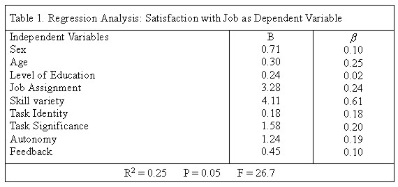 The autonomy variable turned out to be a strong predictor of satisfaction with supervisors (b = 0.18). This results shows that there is a statistically significant relationship between autonomy and satisfaction with supervisors. As expected, such variables as skill variety, task identity, age, and task significance have significant positive influences on public officials satisfaction with their supervisors. Satisfaction with ColleaguesA test of the model produced an R=square of 0.56 for the dependent variable, satisfaction with colleagues, indicating that over 56% of the variance was explained by the nine variables in the model (Table 3).
