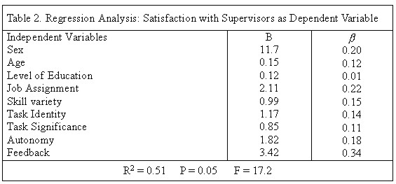 Autonomy is the fifth significant predictor of job satisfaction (b = 0.19). As expected, autonomy has a significant positive effect on public officials job satisfaction. This means that the higher the degree to which the job provides substantial freedom, independence and discretion of the worker in scheduling the work and determining the procedures to be used in carrying out, the higher the level of the worker’s job satisfaction he or she gets from job. As expected, task identity, sex and feedback have significant positive impacts on the level of public officials job satisfaction. Satisfaction with SupervisorsTable 2 shows that eight of the nine variables are statistically significant predictors of public officials’ satisfaction with their supervisors, accounting for more than half of the variance (R2= 0.51). The only one variable did not conform to hypothesized relations was the level of education. All standardized parameter estimates for the model are presented in Table 2. As expected, feedback from the job itself was the best predictor of public officials’ satisfaction with their supervisors (b = 0.34). This means that the amounts of feedback public officials receive from their supervisors have significant positive impacts on the level of satisfaction with supervisors. The job assignment is the second significant predictor of public officials’ satisfaction with their supervisors (b = 0.22). This indicates that officials in cadastral jobs tend to be more satisfied with their supervisors than their counterparts in non-cadastral jobs. The sex is the third important predictor of satisfaction with supervisors (b = 0.20). As expected, this variable has a strong positive impact on satisfaction with supervisor.