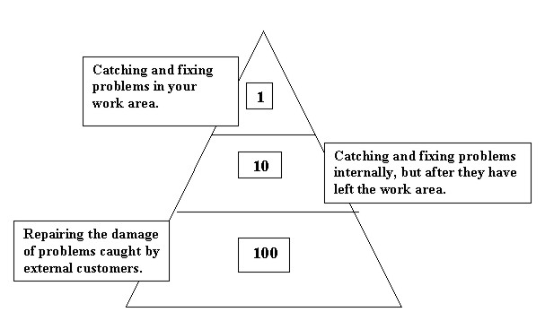 Figure 1. The total 'cost of quality' reduces as the quality improvement process proceeds, prevention costs increase, while inspection and failure costs decrease. (Acknowledgement to ODI) A good rule of thumb for comparing the relative costs of the three categories in your organisation is the "1-10-100 Rule". For every dollar or hour your organisation might spend on preventing a quality problem, it will spend 10 to inspect and correct the mistake after it occurs. If the failure goes unchecked or unnoticed until after the customer has received the service, the cost of rectifying the failure will probably be 100 times what you could have paid to prevent it from happening at all.