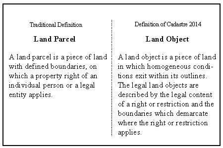 Figure 1. Definition of land objects The content of modern cadastres take into consideration all land objects in a defined area. A definition for Cadastre 2014 may be found in figure 2.