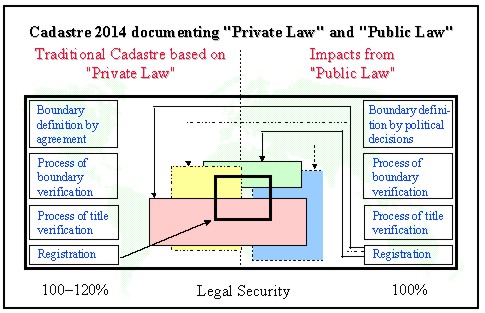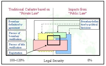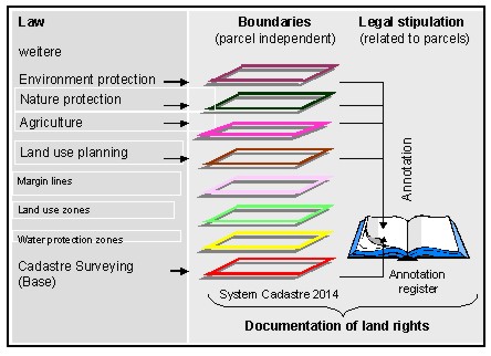 Figure 5. The principle of legal independence The different legal land objects are to be arranged according to the laws by which they are defined. This structure allows the immediate adaptation of the cadastre to the development of the legislation. It is not necessary to rearrange the information when a new law is implemented. New legal topics can be simply added. The second statement on Cadastre 2014 says: The separation between 'maps' and 'registers' will be abolished! The establishment of separate organizations for map production and land registration was often necessary because the two operations used to require different skills, and the available technology did not allow for other solutions. With information technology (IT) it is possible to link land objects directly with the information needed for registration. Land objects can be described in future by the geometric and the alphanumeric parameters, with the latter containing the legally relevant records. The still often practiced separation of the physical and organizational structure will become unnecessary. Statement three takes into consideration that modern information technology based cadastres will have a forceful impact on the way of working: 'Cadastral mapping' will be dead! Long live modelling! Information technology works with digital data and provides the ability to model objects of the real and legal world. Maps as analogue representations will lose their function as information storehouses; their only purpose will be to represent information in such a way that it can be communicated easier and in a more comprehensive form. In future we will have increasingly different graphic representations as extracts of the cadastral model tailored to the needs of the individual customer. To store maps as a picture on a computer is therefore an archaic operation. The fact that in future information technology will be used to operate cadastral systems is expressed by statement four: 'The paper and pencil cadastre' will be gone! As you can see from the terms of reference of the working group, the work concentrated on developed countries because one thought then, that in developing and transitional countries the traditional methods would be carried on. Today, six years later, one cannot find any cadastre project in the world where information technology is not involved. IT makes work easier. The trend to privatize at least the operational work to be executed in the field of cadastre is reflected in statement five: Cadastre 2014 will be highly privatized! Public and private sectors are working closely together! The privatization and new public management topic will affect the cadastre as it affects any other domain of human activity. This is a fundamental trend. The public domain will nevertheless have to provide for secure land titles but it will outsource most operational work and concentrate on supervision. Finally, in statement six the aspect of cost recovery which is also a potent trend is expressed: The cost of Cadastre 2014 will be recoverable! The awareness that even operations executed by the public sector have their price, and that the public and the private sectors have at least to cover their costs leads to efforts to implement cost covering fees also in cadastre. In several cadastral systems it was proved that cost recovery is possible. Because cadastre is a long-term investment the depreciation period for the initial investment costs can be longer than for normal goods. 2. REACTIONS OF THE SURVEYING COMMUNITYThe surveyor's reaction to the brochure was rather positive. A huge interest was shown all over the world. The brochure was translated into further languages such as Albanian, Bulgarian, Finnish, French, Georgian, German, Greek, Korean, Latvian, Macedonian, Polish, Russian, Serbian, Slovenian, Ukrainian. The Australian Institution of Surveyors, asked for the copyright and reprinted 5'000 copies to distribute them to all Australian and New Zealand surveyors. Several universities and other educational institutes have included Cadastre 2014 in their curricula. In several important events, Cadastre 2014 played an important role. Among others, it was taken into consideration during the "International Workshop on Land Tenure and Cadastral Infrastructures For Sustainable Development" in Bathurst, NSW, Australia and the resulting International Seminar in Melbourne in October 1999. Cadastre 2014 was shown there in its future role of a book-keeping system for land management and land administration to support sustainable development. The interest in the vision is still very strong and FIG's Annual Review 99 finds that 'similar best-seller status is predicted for Commission 7's companion publication on reforming the cadastre 'Cadastre 2014''. 3. THE FUTURE ROLE OF CADASTRE 2014 IN SUSTAINABLE DEVELOPMENT OF HUMANKINDThe world, its different cultures, and its political and economic systems are in a permanent development process. This process is driven primarily by the activity and the creativity of humankind. New medical and technical possibilities have impacts on life, on the way of living, and on the way of doing business. One effect of this development is the growth of the world's population. More and more people are to be provided with food and water, housing, household and transport equipment, energy, etc. An increasing number of people are demanding leisure activities and facilities. The demand for waste removal, water cleaning, and recycling materials is increasing. This development leads to an increase in the consumption of natural resources, particularly of land. It has been acknowledged that disorganized consumption of natural resources will lead to a degradation of nature, of the natural world, of the environment, and finally of humankind. Efforts are being made to encourage sustainable development. That means that development should be undertaken in such a way that a minimum of resources are consumed. It is the main 